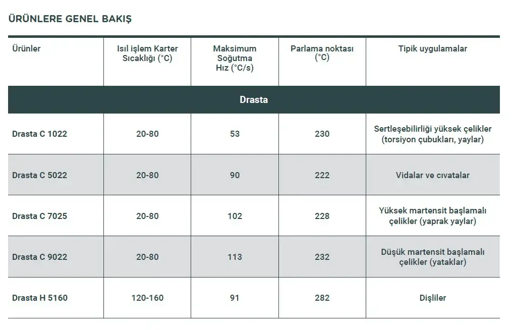 Drasta ısıl işlem yağları, tüm ısıl işlem gereksinimlerine ve her türlü kuruluma uygundur. Bu ürünler, oksidasyona karşı olağanüstü direnç sağlamaları için özenle seçilmiş baz yağları ile formüle edilmiş olup, bileşenlerin mekanik özelliklerini artıran uygun maliyetli bir araç sunarlar.