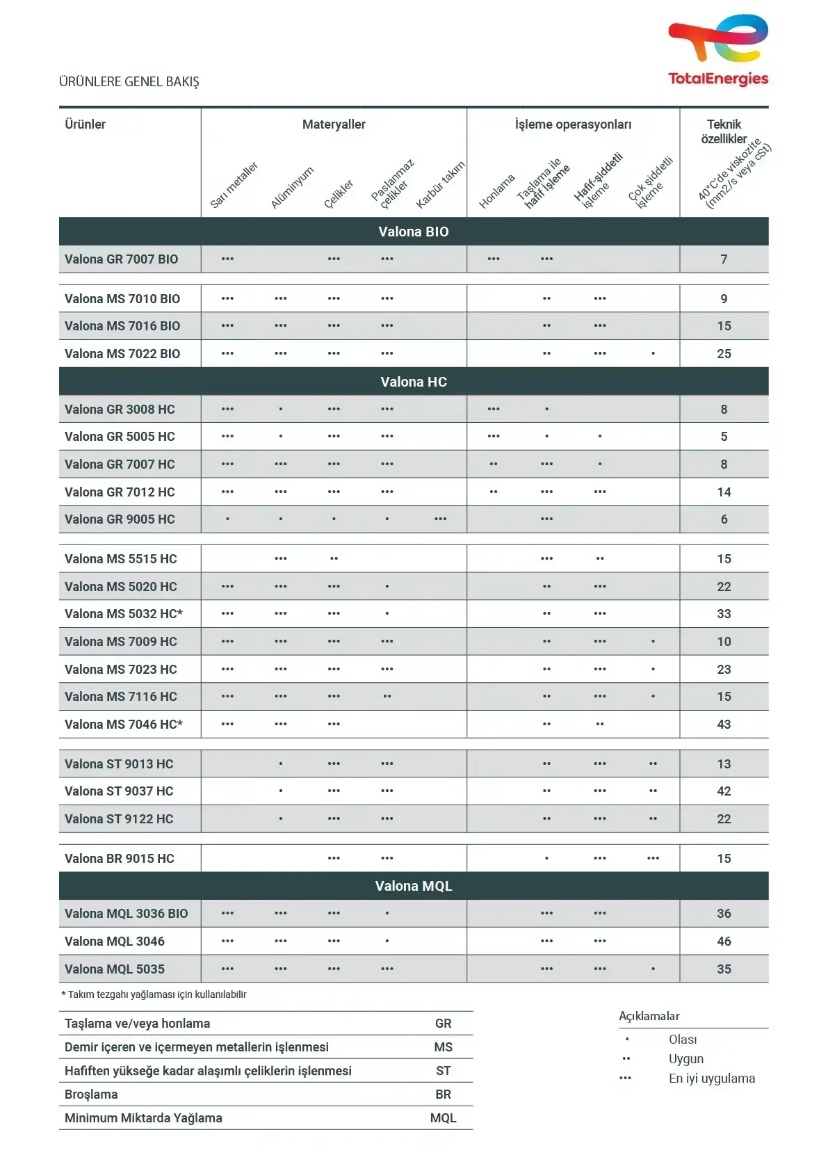3 - VALONA MQL, Minimum Miktarda Yağlama (MQL) sistemlerine özel olarak geliştirilmiş, çeşitli metallerin hafiften ağıra birçok metalin işleme operasyonlarında kullanılmaktadırlar.